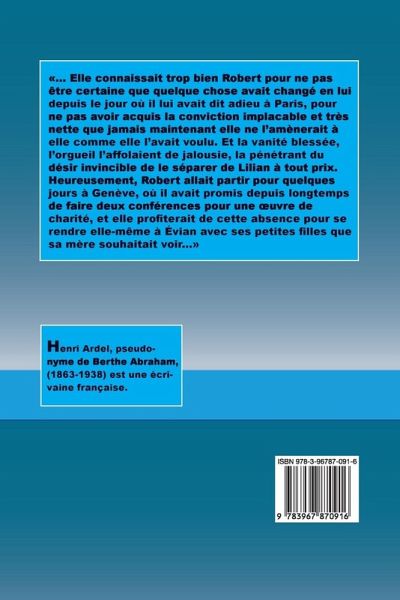 «... Elle connaissait trop bien Robert pour ne pas être certaine que quelque chose avait changé en lui depuis le jour où il lui avait dit adieu à Paris, pour ne pas avoir acquis la conviction implacable et très nette que jamais maintenant elle ne l’amènerait à elle comme elle l’avait voulu. Et la vanité blessée, l’orgueil l’affolaient de jalousie, la pénétrant du désir invincible de le séparer de Lilian à tout prix. Heureusement, Robert allait partir pour quelques jours à Genève, où il avait promis depuis longtemps de faire deux conférences pour une œuvre de charité, et elle profiterait de cette absence pour se rendre elle-même à Évian avec ses petites filles que sa mère souhaitait voir...»