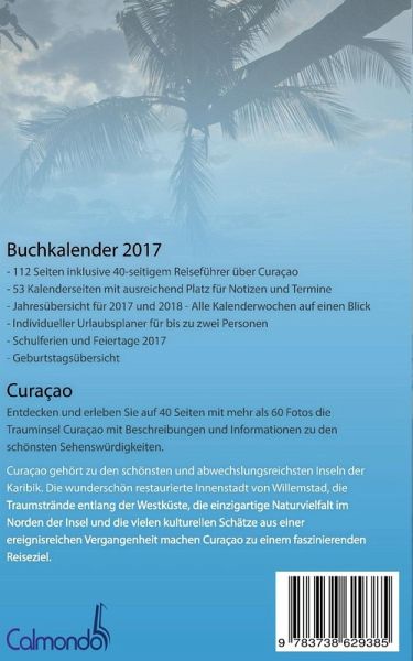 Der 112 Seiten umfassende Kalender bringt nicht nur Ordnung in Ihre Termine, sondern entführt Sie in einem 40-seitigen, mit mehr als 60 Fotos versehenen, Reiseführer auf die wunderschöne Karibikinsel Curaçao.... Erstellen und verwalten Sie Ihre Termine und lassen Sie sich von den schönsten Sehenswürdigkeiten der Insel begeistern. Inhalt: 112 Seiten inklusive 40-seitigem Reiseführer über Curaçao...53 Kalenderseiten mit ausreichend Platz für Notitzen und Termine...Urlaubsplaner für bis zu zwei Personen...Schulferien und Feiertage 2017...Jahresübersichten für 2017 + 2018 - Alle Kalenderwochen auf einem Blick.