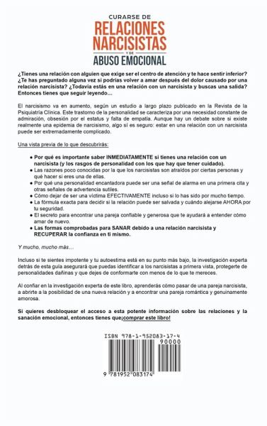 ¿Tienes una relación con alguien que exige ser el centro de atención y te hace sentir inferior? ¿Te has preguntado alguna vez si podrías volver a amar después del dolor causado por una relación narcisista? ¿Todavía estás en una relación con un narcisista y buscas una salida? Entonces tienes que seguir leyendo… El narcisismo va en aumento, según un estudio a largo plazo publicado en la Revista de la Psiquiatría Clínica. Este trastorno de la personalidad se caracteriza por una necesidad constante de admiración, obsesión por el estatus y falta de empatía. Aunque hay un debate sobre si existe realmente una epidemia de narcisismo, algo sí es seguro: estar en una relación con un narcisista puede ser extremadamente complicado. Una vista previa de lo que descubrirás: Por qué es importante saber INMEDIATAMENTE si tienes una relación con un narcisista (y los rasgos de personalidad con los que hay que tener cuidado). Las razones poco conocidas por la que los narcisistas son atraídos por ciertas personas y qué hacer si eres una de ellas. Por qué una personalidad encantadora puede ser una señal de alarma en una primera cita y otras señales de advertencia sutiles. Cómo dejar de ser una víctima EFECTIVAMENTE incluso si lo has sido por mucho tiempo. La fórmula exacta para decidir si la relación puede ser salvada y cuándo alejarse AHORA por tu seguridad. El secreto para encontrar una pareja confiable y generosa que te ayudará a entender cómo amar de nuevo. Las formas comprobadas para SANAR debido a una relación narcisista y RECUPERAR la confianza en ti mismo. Y mucho, mucho más… Incluso si te sientes impotente y tu autoestima está en su punto más bajo, la investigación experta detrás de esta guía asegurará que puedas identificar a los narcisistas a primera vista, protegerte de personalidades dañinas y que dejes de conformarte con menos de lo que te mereces. Al confiar en la investigación experta de este libro, aprenderás cómo pasar de una pareja narcisista, a abrirte a la posibilidad de una nueva relación y a encontrar una pareja romántica y genuinamente amorosa. Si quieres desbloquear el acceso a esta potente información sobre las relaciones y la sanación emocional, entonces tienes que¡comprar este libro!