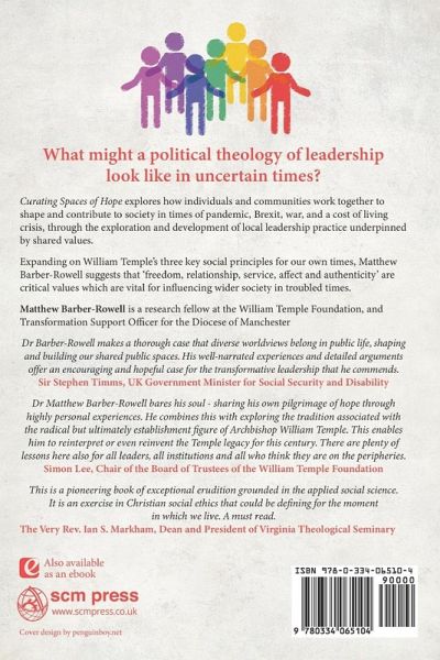 What might a political theology of leadership look like in uncertain times? Curating Spaces of Hope explores how individuals and communities work together to shape and contribute to society in times of pandemic, Brexit, war, and a cost of living crisis, through the exploration and development of local leadership practice underpinned by shared values. Expanding on William Temples' three key social principles for our own times, Matthew Barber-Rowell suggests 'freedom, relationship, service, affect and authenticity' as critical values which are vital in influencing wider society in troubled times.