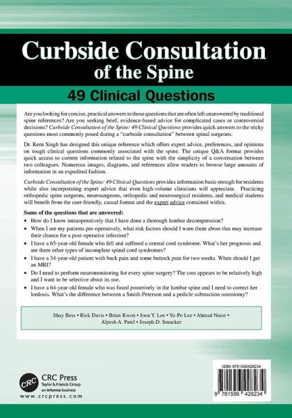 Curbside Consultation of the Spine: 49 Clinical Questions provides quick answers to the tricky questions most commonly posed during a "curbside consultation" between spinal surgeons.