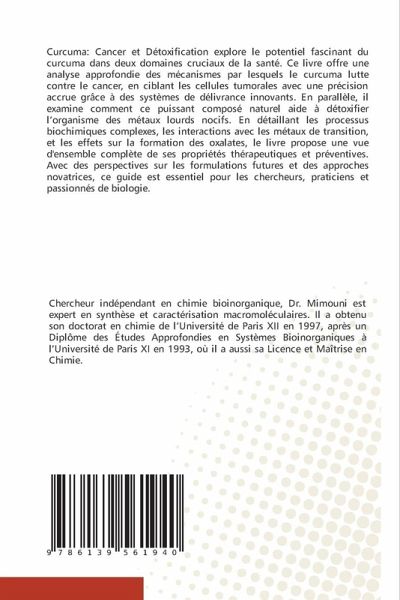 Curcuma: Cancer et Détoxification explore le potentiel fascinant du curcuma dans deux domaines cruciaux de la santé. Ce livre offre une analyse approfondie des mécanismes par lesquels le curcuma lutte contre le cancer, en ciblant les cellules tumorales avec une précision accrue grâce à des systèmes de délivrance innovants. En parallèle, il examine comment ce puissant composé naturel aide à détoxifier l'organisme des métaux lourds nocifs. En détaillant les processus biochimiques complexes, les interactions avec les métaux de transition, et les effets sur la formation des oxalates, le livre propose une vue d'ensemble complète de ses propriétés thérapeutiques et préventives. Avec des perspectives sur les formulations futures et des approches novatrices, ce guide est essentiel pour les chercheurs, praticiens et passionnés de biologie.