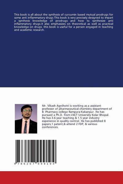 This book is all about the synthesis of curcumin based mutual prodrugs for some anti inflammatory drugs This book is very precisely designed to impart a synthesis knowledge of prodrugs and how to synthesize anti inflammatory drugs.it also emphasizes on theoretical as well as practical knowledge on drugs. this book is useful for a person engaged in teaching and academic research.