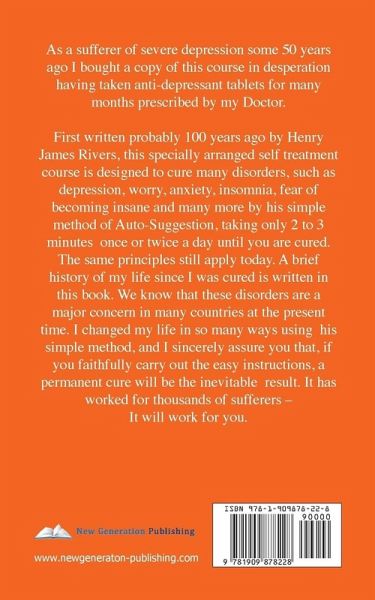 As a sufferer of severe depression some 50 years ago I bought a copy of this course in desperation having taken anti-depressant tablets for many months prescribed by my Doctor. First written probably 100 years ago by Henry James Rivers, this specially arranged self treatment course is designed to cure many disorders, such as depression, worry, anxiety, insomnia, fear of becoming insane and many more by his simple method of Auto-Suggestion, taking only 2 to 3 minutes once or twice a day until you are cured. The same principles still apply today. A brief history of my life since I was cured is written in this book. We know that these disorders are a major concern in many countries at the present time. I changed my life in so many ways using his simple method, and I sincerely assure you that, if you faithfully carry out the easy instructions, a permanent cure will be the inevitable result. It has worked for thousands of sufferers-- It will work for you.