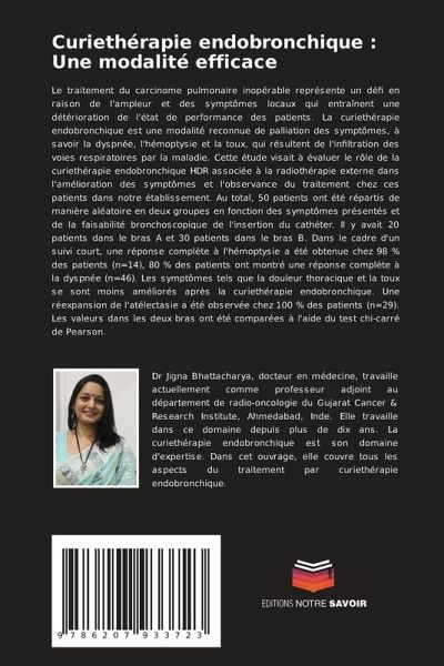 Le traitement du carcinome pulmonaire inopérable représente un défi en raison de l'ampleur et des symptômes locaux qui entraînent une détérioration de l'état de performance des patients. La curiethérapie endobronchique est une modalité reconnue de palliation des symptômes, à savoir la dyspnée, l'hémoptysie et la toux, qui résultent de l'infiltration des voies respiratoires par la maladie. Cette étude visait à évaluer le rôle de la curiethérapie endobronchique HDR associée à la radiothérapie externe dans l'amélioration des symptômes et l'observance du traitement chez ces patients dans notre établissement. Au total, 50 patients ont été répartis de manière aléatoire en deux groupes en fonction des symptômes présentés et de la faisabilité bronchoscopique de l'insertion du cathéter. Il y avait 20 patients dans le bras A et 30 patients dans le bras B. Dans le cadre d'un suivi court, une réponse complète à l'hémoptysie a été obtenue chez 98 % des patients (n=14), 80 % des patients ont montré une réponse complète à la dyspnée (n=46). Les symptômes tels que la douleur thoracique et la toux se sont moins améliorés après la curiethérapie endobronchique. Une réexpansion de l'atélectasie a été observée chez 100 % des patients (n=29). Les valeurs dans les deux bras ont été comparées à l'aide du test chi-carré de Pearson.