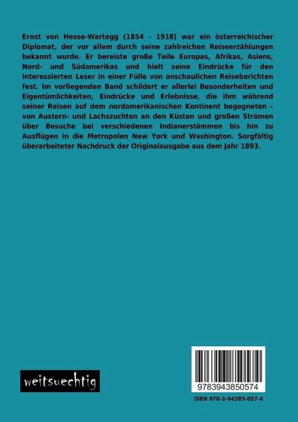 Ernst von Hesse-Wartegg (1854 - 1918) war ein österreichischer Diplomat, der vor allem durch seine zahlreichen Reiseerzählungen bekannt wurde. Er bereiste große Teile Europas, Afrikas, Asiens, Nord- und Südamerikas und hielt seine Eindrücke für den interessierten Leser in einer Fülle von anschaulichen Reiseberichten fest. Im vorliegenden Band schildert er allerlei Besonderheiten und Eigentümlichkeiten, Eindrücke und Erlebnisse, die ihm während seiner Reisen auf dem nordamerikanischen Kontinent begegneten von Austern- und Lachszuchten an den Küsten und großen Strömen über Besuche bei verschiedenen Indianerstämmen bis hin zu Ausflügen in die Metropolen New York und Washington. Sorgfältig überarbeiteter Nachdruck der Originalausgabe aus dem Jahr 1893.