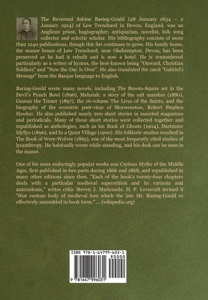 The Reverend Sabine Baring-Gould (28 January 1834 - 2 January 1924) of Lew Trenchard in Devon, England, was an Anglican priest, hagiographer, antiquarian, novelist, folk song collector and eclectic scholar. His bibliography consists of more than 1240 publications, though this list continues to grow. His family home, the manor house of Lew Trenchard, near Okehampton, Devon, has been preserved as he had it rebuilt and is now a hotel. He is remembered particularly as a writer of hymns, the best-known being "Onward, Christian Soldiers" and "Now the Day Is Over". He also translated the carol "Gabriel's Message" from the Basque language to English. Baring-Gould wrote many novels, including The Broom-Squire set in the Devil's Punch Bowl (1896), Mehalah: a story of the salt marshes (1880), Guavas the Tinner (1897), the 16-volume The Lives of the Saints, and the biography of the eccentric poet-vicar of Morwenstow, Robert Stephen Hawker. He also published nearly 200 short stories in assorted magazines and periodicals. Many of these short stories were collected together and republished as anthologies, such as his Book of Ghosts (1904), Dartmoor Idyllys (1896), and In a Quiet Village (1900). His folkloric studies resulted in The Book of Were-Wolves (1865), one of the most frequently cited studies of lycanthropy. He habitually wrote while standing, and his desk can be seen in the manor. One of his most enduringly popular works was Curious Myths of the Middle Ages, first published in two parts during 1866 and 1868, and republished in many other editions since then. "Each of the book's twenty-four chapters deals with a particular medieval superstition and its variants and antecedents," writes critic Steven J. Mariconda. H. P. Lovecraft termed it "that curious body of medieval lore which the late Mr. Baring-Gould so effectively assembled in book form." ... (wikipedia.org)