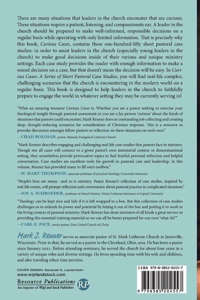 There are many situations that leaders in the church encounter that are curious. These situations require a patient, listening, and compassionate ear. A leader in the church should be prepared to make well-informed, responsible decisions on a regular basis while operating with only limited information. That is precisely why this book, Curious Cases, contains these one-hundred-fifty short pastoral case studies: in order to assist leaders in the church (especially young leaders in the church) to make good decisions inside of their various and unique ministry settings. Each case study provides the reader with enough information to make a sound decision on a case, but that doesn't mean the decision will be easy. In Curious Cases: A Series of Short Pastoral Case Studies, you will find real-life complex, challenging scenarios that the church is encountering in the modern world on a regular basis. This book is designed to help leaders in the church to faithfully prepare to engage the world in whatever setting they may be currently serving in!