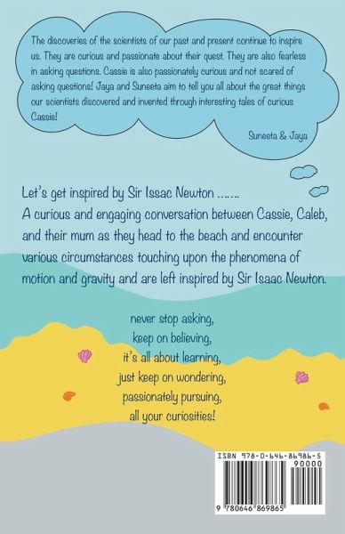 Curious Cassie Curious Cassie is a set of early reader books telling fascinating tales about the discoveries of our scientists to spark curiosity and courage to pursue the quests! The discoveries led by the scientists of our past and present continue to inspire us. These folks are curious and passionate about their pursuit. They are also fearless in asking questions. In fact, Albert Einstein, one of the great scientists of all time, once said,I have no special talent. I am only passionately curious! The contributors of the Curious Cassie books aim to tell you all about the great things our scientists discovered and invented through a series of fascinating tales! Both Suneeta and Jaya, the author and illustrator respectively, feel the need for more books that spark curiosity in the kids and encourage them to ask questions and follow through with their quests. Being closely connected to science and engineering, they feel perhaps there are better ways to get our younger 6-8 age kids to start thinking about STEM and being inspired by great scientists and philosophers of all times.The Curious Cassie book series aims to address that. Cassie, a 6-year-old kid, is also passionately curious and not scared of asking questions! Every book in this series is devoted to a scientist whose discoveries are canvassed through fun and engaging conversations led by Cassie and her family. The important message, Jaya and Suneeta want to deliver are: Never stop asking,Keep on believing,It's all about learning,Just keep on wondering,Passionately pursuing,All your Curiosities! What in this book: In this debut book, Curious Cassie's beach ride quest, we will celebrate the discoveries of Sir Isaac Newton's! It contains: A curious and engaging conversation between Cassie, Caleb, and their mum as they head to the beach and encounter various circumstances touching upon the phenomena of motion and gravity and are left inspired by Sir Isaac Newton.