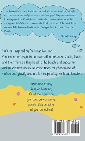 Curious Cassie Curious Cassie is a set of early reader books telling fascinating tales about the discoveries of our scientists to spark curiosity and courage to pursue the quests! The discoveries led by the scientists of our past and present continue to inspire us. These folks are curious and passionate about their pursuit. They are also fearless in asking questions. In fact, Albert Einstein, one of the great scientists of all time, once said,I have no special talent. I am only passionately curious! The contributors of the Curious Cassie books aim to tell you all about the great things our scientists discovered and invented through a series of fascinating tales! Both Suneeta and Jaya, the author and illustrator respectively, feel the need for more books that spark curiosity in the kids and encourage them to ask questions and follow through with their quests. Being closely connected to science and engineering, they feel perhaps there are better ways to get our younger 6-8 age kids to start thinking about STEM and being inspired by great scientists and philosophers of all times.The Curious Cassie book series aims to address that. Cassie, a 6-year-old kid, is also passionately curious and not scared of asking questions! Every book in this series is devoted to a scientist whose discoveries are canvassed through fun and engaging conversations led by Cassie and her family. The important message, Jaya and Suneeta want to deliver are: Never stop asking,Keep on believing,It's all about learning,Just keep on wondering,Passionately pursuing,All your Curiosities! What in this book: In this debut book, Curious Cassie's beach ride quest, we will celebrate the discoveries of Sir Isaac Newton's! It contains: A curious and engaging conversation between Cassie, Caleb, and their mum as they head to the beach and encounter various circumstances touching upon the phenomena of motion and gravity and are left inspired by Sir Isaac Newton.