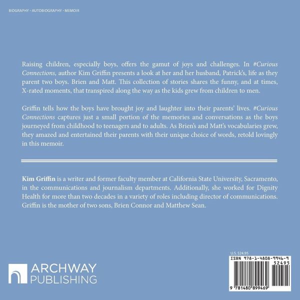 Raising children, especially boys, offers the gamut of joys and challenges. In #Curious Connections, author Kim Griffin presents a look at her and her husband, Patrick's, life as they parent two boys. Brien and Matt. This collection of stories shares the funny, and at times, X-rated moments, that transpired along the way as the kids grew from children to men. Griffin tells how the boys have brought joy and laughter into their parents' lives. #Curious Connections captures just a small portion of the memories and conversations as the boys journeyed from childhood to teenagers and to adults. As Brien's and Matt's vocabularies grew, they amazed and entertained their parents with their unique choice of words, retold lovingly in this memoir.