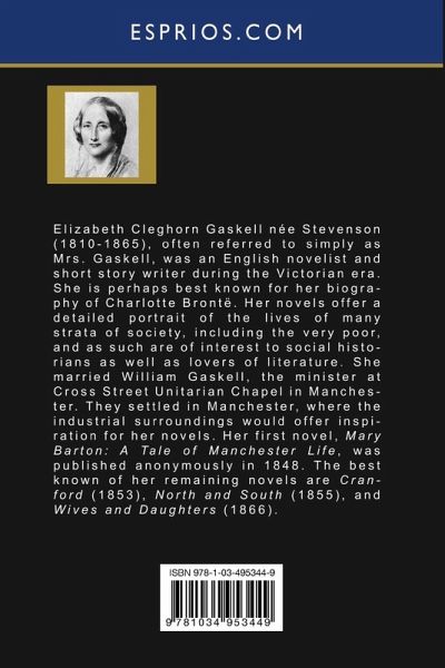Elizabeth Cleghorn Gaskell née Stevenson (1810-1865), often referred to simply as Mrs. Gaskell, was an English novelist and short story writer during the Victorian era. She is perhaps best known for her biography of Charlotte Brontë. Her novels offer a detailed portrait of the lives of many strata of society, including the very poor, and as such are of interest to social historians as well as lovers of literature. She married William Gaskell, the minister at Cross Street Unitarian Chapel in Manchester. They settled in Manchester, where the industrial surroundings would offer inspiration for her novels. Her first novel, Mary Barton: A Tale of Manchester Life, was published anonymously in 1848. The best known of her remaining novels are Cranford (1853), North and South (1855), and Wives and Daughters (1866).