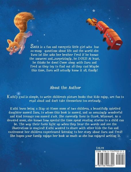 SARA is a very curious little girl who has so many questions about life and the world she lives in! "Why do the stars shine so bright? Why are blue gum balls such a wonderful treat?" She asks her brother Fred if he knows the answers and, surprisingly, he DOES! At least, he thinks he does! Come along with Sara and Fred as they try to find out all they can! This sweet and super silly rhyming book is beautifully illustrated with plenty of artistic details for you and your child to enjoy each time you open the book!