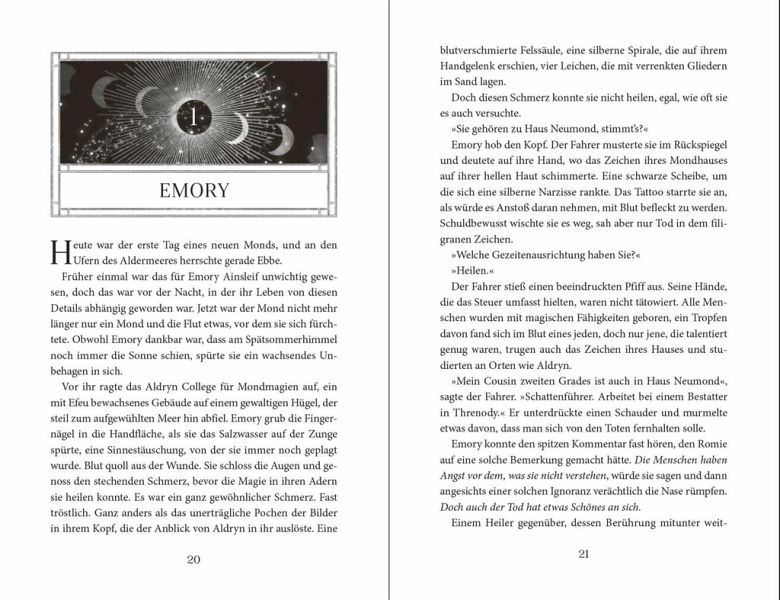 Reihenauftakt vor, der vor allem jene Leser begeistern dürfte, die komplexe Fantasybücher im Jugendbereich…mehrDa ich Dark Akademia liebe, war dieses Werk ein absolutes Must-Read für mich. Bereits die Leseprobe konnte mich überzeugen. Und wow, dieses Buch ist so viel mehr als ich erwartet hatte. Poetisch, magisch, düstere, schön und schrecklich zugleich. Mit „Curious Tides“ legt Pascale Lacelle einen Reihenauftakt vor, der vor allem jene Leser begeistern dürfte, die komplexe Fantasybücher im Jugendbereich mögen. Man darf sich auf ein Werk freuen, das in eine Welt voller Magie entführt. Bereits das Setting voller Dark Academia Vibes konnte mich begeistern. Die Geschichte spielt hauptsächlich am Aldryn College, wo Mondmagier ausgebildet werden. Der Leser begleitet Emory und Baz, die beide um Romie trauern. Ein mysteriöser Geheimbund, magische Rituale und eine Höhle voller dunkler Geheimnisse und Albträume sorgen für unterschwellige Spannung. Und dann sind da noch Romie und die anderen acht ertrunkenen Studenten.