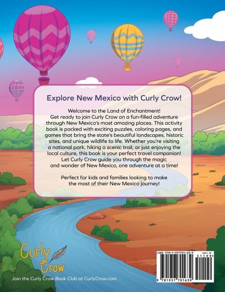Explore New Mexico with Curly Crow! Welcome to the Land of Enchantment! Get ready to join Curly Crow on a fun-filled adventure through New Mexico's most amazing places. This activity book is packed with exciting puzzles, coloring pages, and games that bring the state's beautiful landscapes, historic sites, and unique wildlife to life. Whether you're visiting a national park, hiking a scenic trail, or just enjoying the local culture, this book is your perfect travel companion! Let Curly Crow guide you through the magic and wonder of New Mexico, one adventure at a time! Perfect for kids and families looking to make the most of their New Mexico journey!