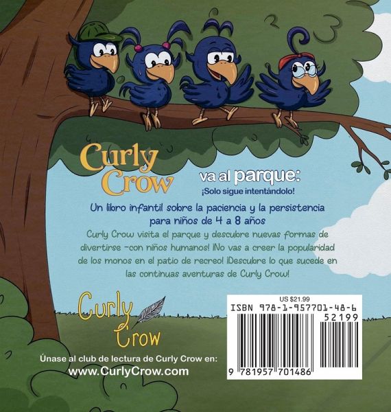 Curly Crow Goes to the Park - Spanish Edition. Books that inspire imagination and encourage a love for reading. Curly Crow children's books are an excellent way to bring families together and create lasting memories. These books are not only entertaining but also educational, making them the perfect tool for parents who want to bond with their children while helping them learn. Un libro infantil sobre la paciencia y la persistencia para niños de 4 a 8 años. Curly Crow visita el parque y descubre nuevas formas de divertirse, ¡con niños! ¡No vas a creer la aventura en el pasamanos en el patio de recreo! ¡Descubre lo que sucede en las siguientes aventuras de Curly Crow!