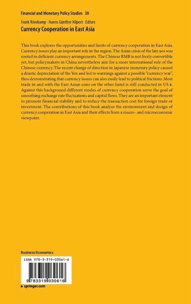 Frank Rövekamp, Hanns Günther Hilpert: Currency Area East Asia - Cooperation or Confrontation? - Patrick Hess: China's Financial System: Past Reforms, Future Ambitions and Current State.- Franz Waldenberger: Japan's New Monetary Policy - Some Critical Questions.- Ulrich Volz: RMB Internationalisation and Currency Cooperation in East Asia.- Kenichi Shimizu: Regional Exchange Rate Management in East Asia - Possibilities and Limits.- Werner Pascha: The Chiang Mai Process as a Case Study of Financial Cooperation in Pacific Asia - Institutional Issues and Experiences.- Andreas Steiner: Reserve Policies of East Asian Central Banks - Causes, Consequences and Prospects.- Jerome Shin: Korea-China Currency Swap-Financed Trade Settlement Facility.- Hans Bleuel: Asian Currency Cooperation and the Potential Microeconomic Effects of Reduced Exchange Rate Fluctuations.- Franziska Schobert, Lijun Yu: The Role of Reserve Requirements - The Case of Contemporary China Compared to Postwar Germany.