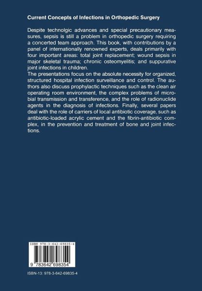 Epidemiology of Hospital Infection -The Role of the Microbiologist.- The Role of the Infectious Disease Physician.- Diagnosis and Treatment of Malnutrition in the Traumatized Patient.- Skin Bacterial Populations -Contamination or Infection?.- Infections in Orthopedics: Patient Preparation and Skin Scrub.- Clean Air Operating Environment and Superficial Infection.- Specific Measures to Reduce Operating Room Infections.- Clean Wound Surveillance.- Microbial Study of Surgical Drain Cultures.- The Microcomputer for Operating Room Infection Surveillance.- Diagnosis of Acute Bone Infection.- The Role of Radionuclide Studies in the Diagnosis of Infections in Orthopedic Surgery.- The History of a Patient with an Infected Total Joint Replacement.- Joint Replacement Infections: Prophylaxis, Diagnosis and Treatment.- Prevention of Infection in Total Hip Replacement.- Prophylactic Effect of Gentamicin Cement.- Open Fractures -Is Primary Stabilization Desirable?.- Compound Fractures: The European Approach.- Subacute Osteomyelitis in Children.- Modern Trends in the Investigation and Treatment of Chronic Osteomyelitis.- Acute Suppurative Joint Infections in Children.- Current Concepts in the Management of Infected Fractures.- Infected Pseudarthrosis -Treat the Infection First.- Infection in Total Joint Replacement: One-Stage Exchange Arthroplasty.- Deep Infection of Total Joint Replacement: Principles of Treatment.- Revision of Infected Total Joint Replacement: Swedish Experiences.- Reimplantation of Infected Joint Replacements: Elution Studies of Gentamicin from Cement and Beads.- Septic and Aseptic Hip and Knee Replacements: Results of Revision.- Infection: Occupational Hazard to the Surgeon.- Isolation of the Infected Patient.- Isolation Ward (Septic Ward) for InfectedPatients.- Antibiotic-Resistant Microorganisms.- The Use of Antibiotics in Traumatized Patients.- Parenteral versus Oral Antibiotic Therapy.- Antibiotic-Loaded Acrylic Cement (ALAC).- Gentamicin-PMMA Beads and Artificial Wound Coverage.- The Use of Gentamicin-PMMA Beads in Chronic Osteomyelitis.- Fibrin-Antibiotic Complex: Laboratory Investigation and Clinical Results.