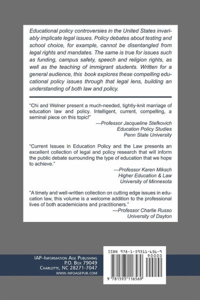 Educational policy controversies in the United States invariably implicate legal issues. Policy debates about testing and school choice, for example, cannot be disentangled from legal rights and mandates. The same is true for issues such as funding, campus safety, speech and religion rights, as well as the teaching of immigrant students. Written for a general audience, this new twelve-chapter book explores these compelling educational policy issues through that legal lens, building an understanding of both law and policy. The book's editors are Kevin Welner, associate professor of educational policy at the University of Colorado at Boulder, and Wendy Chi, a doctoral candidate at Boulder. Both Welner and Chi are lawyers as well as educational scholars.