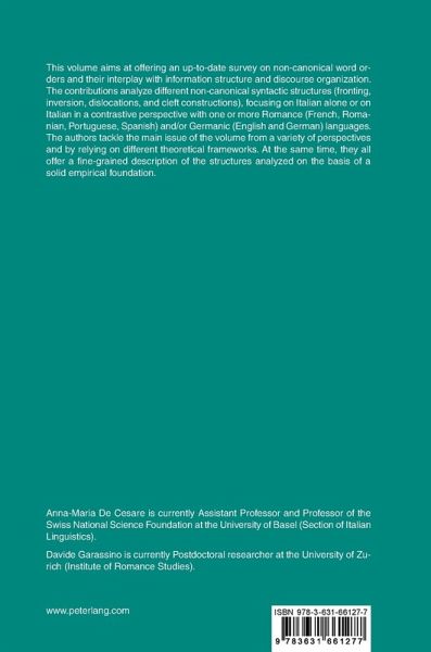 This volume aims at offering an up-to-date survey on non-canonical word orders and their interplay with information structure and discourse organization. The contributions analyze different non-canonical syntactic structures (fronting, inversion, dislocations, and cleft constructions), focusing on Italian alone or on Italian in a contrastive perspective with one or more Romance (French, Romanian, Portuguese, Spanish) and/or Germanic (English and German) languages. The authors tackle the main issue of the volume from a variety of perspectives and by relying on different theoretical frameworks. At the same time, they all offer a fine-grained description of the structures analyzed on the basis of a solid empirical foundation.