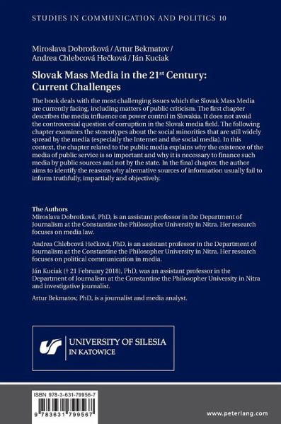The book deals with the problems of media communication and its formation in the Slovak Republic in and after 1993. It focuses on the social function of the media in the sense of journalistic communication. The authors also address the problems of gender stereotypes presented through social networks and advertising in all kinds of media in Slovakia and abroad. This book also explores the question of forming a theoretical basis for the creation of mass media communication (print media, film, photography, literature, works in marketing communication, books). This book does not elaborate on all problems of the mass media in the Slovak Republic, but it attempts to examine the key issues.