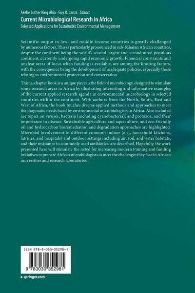 Scientific output in low- and middle-income countries is greatly challenged by numerous factors. This is particularly pronounced in sub-Saharan African countries, despite the continent being the world's second largest and second most-populous continent, currently undergoing rapid economic growth. Financial constraints and unclear areas of focus when funding is available, are among the limiting factors, with the consequence being the development of inadequate policies, especially those relating to environmental protection and conservation. This 13-chapter book is a unique piece in the field of microbiology, designed to stimulate some research areas in Africa by illustrating interesting and informative examples of the current applied research agenda in environmental microbiology in selected countries within the continent. With authors from the North, South, East and West of Africa, the book touches diverse applied methods and approaches to meet the pragmatic needs faced by environmental microbiologists in Africa. Also included are topics on viruses, bacteria (including cyanobacteria), and protozoa, and their importance in disease. Sustainable agriculture and aquaculture, and eco-friendly oil and hydrocarbon bioremediation and degradation approaches are highlighted. Microbial involvement in different common indoor (e.g., household kitchens, latrines, and hospitals) and outdoor settings including air, soil, and water habitats, and their resistance to commonly used antibiotics, are described. Hopefully, the work presented here will stimulate the need for increasing modern training and funding initiatives to prepare African microbiologists to meet the challenges they face in African universities and research laboratories.