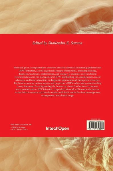 This book gives a comprehensive overview of recent advances in human papillomavirus (HPV) infection, as well as general concepts of infections, immunopathology, diagnosis, treatment, epidemiology, and etiology. It examines current clinical recommendations in the management of HPV, highlighting the ongoing issues, recent advances, and future directions in diagnostic approaches and therapeutic strategies. The book focuses on various aspects and properties of HPV, whose deep understanding is very important for safeguarding the human race from further loss of resources and economies due to HPV infection. I hope that this work will increase the interest in this field of research and that the readers will find it useful for their investigations, management, and clinical usage.