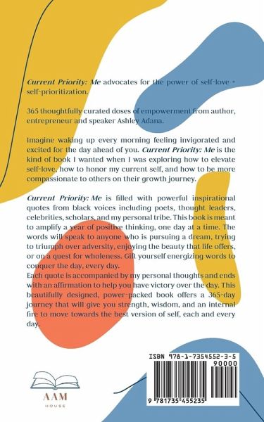 Current Priority: Me advocates for the power of self-love + self-prioritization. 365 thoughtfully curated doses of empowerment from author, entrepreneur and speaker Ashely Adana. Imagine waking up every morning feeling invigorated and excited for the day ahead of you. Current Priority: Me is the kind of book I wanted when I was exploring how to elevate self-love, how to honor my current self, and how to be more compassionate to others on their growth journey. Current Priority: Me is filled with powerful inspirational quotes from black voices including poets, thought leaders, celebrities, scholars, and my personal tribe. This book is meant to amplify a year of positive thinking, one day at a time. The words will speak to anyone who is pursuing a dream, trying to triumph over adversity, enjoying the beauty of that life offers, or on a quest for wholeness. Gift yourself energizing words to conquer the day, every day. Each quote is accompanied by my personal thoughts and ends with an affirmation to help you have victory over the day. This beautifully designed, power-packed book offers a 365-day journey that will give you strength, wisdom, and an internal fire to move towards the best version of self, each and every day.