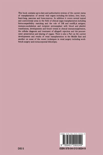 One: Histocompatibility matching and the blood transfusion effect.- 1. High and low responsiveness in renal transplantation and its impact on HLA matching.- 2. HLA A and B matching, the mixed lymphocyte reaction and renal allograft survival in a single centre.- 3. The role of vascular endothelial cell antigens in renal transplantation.- 4. Blood transfusion(s) and cadaveric renal transplantation in the Netherlands.- Two: Immunosuppression and immunological monitoring.- 5. The development of immunosuppression.- 6. Antilymphocyte globulin infusion in the treatment of acute allograft rejection: a prospective study.- 7. Cyclosporin in renal transplantation: results of the Minnesota randomised trial.- 8. Antilymphocyte globulin and thoracic duct drainage in renal transplantation.- 9. Monitoring of organ allograft rejection by fine needle aspiration cytology.- Three: Donor procurement and organ preservation.- 10. Organ procurement and transportation.- 11. Procurement of kidneys from non heart beating donors.- 12. Donor age in cadaveric renal transplantation.- 13. Prolonged preservation of imported cadaveric grafts by ice cooling with Eurocollin's solution versus hypothermic pulsatile perfusion.- 14. A new approach to prolonged kidney preservation.- Four: Vascular access surgery in renal transplantation.- 15. The upper arm A. V. fistula for chronic haemodialysis: long term followup.- 16. Permanent vascular access for haemodialysis: the Kuwait experience.- Five: Renal transplantation.- 17. Current status of renal transplantation.- 18. The living donor for kidney transplantation: a review of 100 consecutive donors.- 19. Kidney transplantation in diabetic recipients: factors leading to improved results.- 20. Fungal infections in 135 renal transplantations.- 21. Bilateral renaltransplantation: effect on pelvic hemodynamics and sexual function in male patients.- Six: Renal transplantation and dialysis in the Middle East.- 22. Renal replacement therapy in Kuwait.- 23. The development of renal transplantation programme in Kuwait and the results in the first 142 grafts.- 24. Living related kidney transplantation in Turkey.- Seven: Pancreas transplantation.- 25. Clinical pancreas and islet transplantation: registry statistics and an overview.- 26. Pancreas transplantation in Lyon 1976-1983.- 27. Pancreas transplantation at the University of Minnesota: experience with 68 recent cases.- Eight: Heart and heart-lung transplantation.- 28. Cardiac transplantation.- 29. Heart-lung transplantation.- 30. Immunosuppressive therapy for cardiac transplantation.- Nine: Liver transplantation.- 31. Current status of liver transplantation.- Ten: Bone marrow transplantation.- 32. Current status of bone marrow transplantation.- Eleven: Recent advances in renal surgery.- 33. Renal autotransplantation and extracorporeal renal surgery.- 34. Hypothermic in situ perfusion and surface cooling in renal surgery.- 35. Extracorporeal shock wave lithotripsy: a new aspect in the treatment of kidney stones.