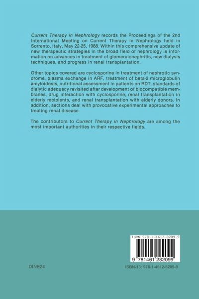 This book includes the proceedings of the 2nd International Meeting on Cur rent Therapy in Nephrology held in Sorrento, Italy, May 22-25, 1988. The book provides a comprehensive update on new therapeutic strategies in the broad field of Nephrology. The reader will receive information on advances in treatment of glomerulonephritis, new dialysis techniques and progress in renal transplantation. In addition, sections deal with provocative experimental ap proaches to treating renal disease. Topics include: cyclosporine in treatment of nephrotic syndrome, plasma ex change in ARF, treatment of beta-2 microglobulin amyloidosis, nutritional of dialytic adequacy revisited after assessment in patients on RDT, standards development of biocompatible membranes, drug interaction with cyclosporine, renal transplantation in elderly recipients, and renal transplantation with elderly donors. A special effort was made to recruit contributors among the most important scientific authorities in their respective fields: we are grateful to Drs. Cameron, Lamm, Isemberg, Meyrier, Niaudet, Brynger, Lundgren, Fauchald, Cockburn, Gotch, Kopple, Cheung and Horl for having accepted our invitation. We are also indebted to all other authors who participated in the meeting and submitted their original papers for publication. I.