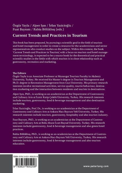 Ozgur Yayla is an Associate Professor at Manavgat Tourism Faculty in Akdeniz University, Turkey. He received his Master's degree in Tourism Management and Ph.D. degree in Recreation Management from Gazi University. His primary research interests involve recreational activities, service quality, tourist behaviour, destination marketing and the interaction between residents and tourists in destinations. Alper Is ¿¿, PhD., is working as an academician at the Department of Gastronomy and Culinary Arts at I¿mir Katip Celebi University, Turkey. His research interests include tourism, gastronomy, food & beverage management and also destination marketing. I¿fan Yaziciog¿u , Prof. Dr., is working as an academician at the Department of Gastronomy and Culinary Arts at Ankara Hac¿Bayram Veli University, Turkey. His research interests include tourism, gastronomy, hospitality and also tourism industry. Faut Bayram , PhD., is working as an academician at the Department of Gastronomy and Culinary Arts at Bolu Abant I¿zet Baysal University, Turkey. His research interests include gastronomy, food & beverage management and also green hotel practices. Rabia Bolukbas ¿, PhD., is working as an academician at the Department of Gastronomy and Culinary Arts at Ankara Hac¿Bayram Veli University, Turkey. His research interests include gastronomy, food & beverage management and also tourism education.