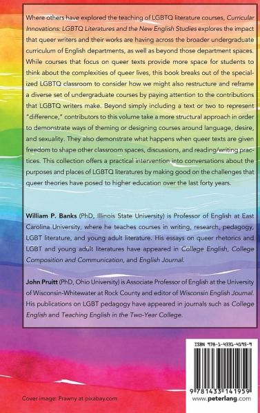 William P. Banks/John Pruitt: Queer Pedagogies, Queer Literacies: LGBTQ Texts Across the English Studies Curriculum - Tom Sarmiento: Contingently Queer: Decolonizing and Unsettling the Boundaries of Identitarian-Based Literatures - Juliane Römhild/Damien Barlow/Karyn Lehner: Queering the English Core: Middlesex and Queer Pedagogy - Eric Keenaghan: Past, Present, and Potential: Teaching LGBT+ Poetry Historically - Lance Weldy: Mainstreaming Difference in Youth Sexualities/Identities: Demystifying the Otherness of LGBT Youth Literature Through the Hetero-Corollary - Mica Hilson: Slipping Queer Underneath the Radar: A Reflection on Teaching "Bizarre Love Triangles in Fiction"- Cathy Rex: Cross Dressing in Early America: A Course in Transgressive Figures Before 1865 - Veronica Keiffer-Lewis/Julie Keiffer-Lewis: Centering the Queer, Black, Female Voice: A Case Study of Reclaiming the Soul Through Literature - Contributors - Index.