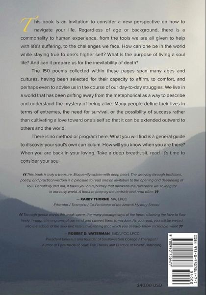 This book is an invitation to consider a new perspective on how to navigate your life. Regardless of age or background, there is a commonality to human experience, from the tools we are all given to help with life’s suffering, to the challenges we face. How can one be in the world while staying true to one’s higher self? What is the purpose of living a soul life? And can it prepare us for the inevitability of death? The 150 poems collected within these pages span many ages and cultures, having been selected for their capacity to affirm, to comfort, and perhaps even to advise us in the course of our day-to-day struggles. We live in a world that has been drifting away from the metaphorical as a way to describe and understand the mystery of being alive. Many people define their lives in terms of extremes, the need for survival, or the possibility of success rather than cultivating a love toward one’s self so that it can be extended outward to others and the world. There is no method or program here. What you will find is a general guide to discover your soul’s own curriculum. How will you know when you are there? When you are back in your loving. Take a deep breath, sit, read. It’s time to consider your soul.