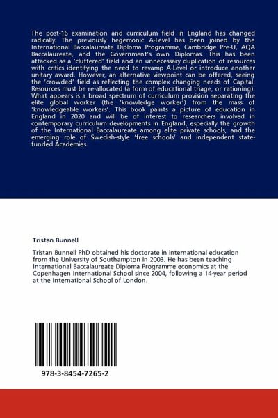 The post-16 examination and curriculum field in England has changed radically. The previously hegemonic A-Level has been joined by the International Baccalaureate Diploma Programme, Cambridge Pre-U, AQA Baccalaureate, and the Government s own Diplomas. This has been attacked as a cluttered field and an unnecessary duplication of resources with critics identifying the need to revamp A-Level or introduce another unitary award. However, an alternative viewpoint can be offered, seeing the crowded field as reflecting the complex changing needs of Capital. Resources must be re-allocated (a form of educational triage, or rationing). What appears is a broad spectrum of curriculum provision separating the elite global worker (the knowledge worker ) from the mass of knowledgeable workers . This book paints a picture of education in England in 2020 and will be of interest to researchers involved in contemporary curriculum developments in England, especially the growth of the International Baccalaureate among elite private schools, and the emerging role of Swedish-style free schools and independent state-funded Academies.
