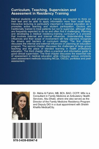 Medical students and physicians in training are required to think on their feet and be able to apply information more than recall facts. Interactive lecturing is particularly important in medical education as it promotes active learning and student participation. Doctors are traditionally trained to treat patients but not to supervise, although they are frequently expected to do so and often find it challenging. Planning and developing a medical residency-training curriculum is a process that involves external and internal influences. Understanding these influences and their scope of involvement will help planners recognize the drivers and barriers of curriculum design. The first chapter discusses the internal and external influences on planning an education program. The second chapter discusses the challenges of large group teaching and the place of blended learning in health professions education. The third chapter offers a practical and informative guide to good clinical supervision. The final chapter discusses the essential role of assessment in medical education while critiquing various commonly used assessment methods including MCQs, OSCEs, portfolios and peer assessment.