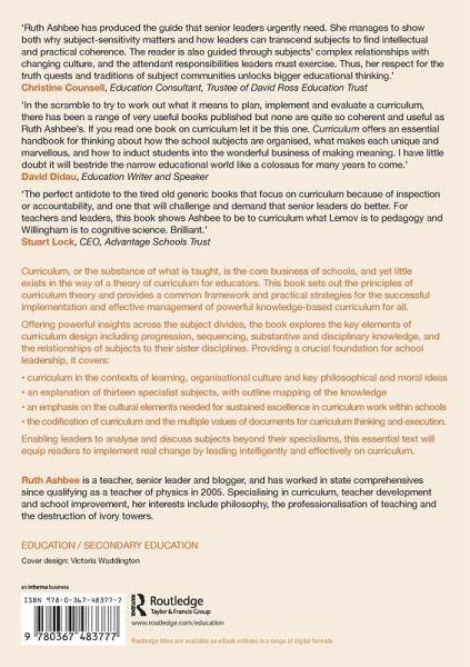 'Has there ever been an aspect of education more misunderstood, more neglected and more important than curriculum? For many years 'the curriculum' was broadly synonymous with the timetable and the subjects a school offered. For teachers, the job of thinking about what children would study was outsourced to exam boards and DfE documents. But times they are a-changin'. The past few years has seen many school leaders and teachers begin to come to terms with the extent of their ignorance on this most crucial aspect of children's education and there has been an explosion of interest in curriculum thinking. In the scramble to try to work out what it means to plan, implement and evaluate a curriculum, there a have been a range of very useful books published but none are quite so coherent and useful as Ruth Ashbee's. If you read one book on curriculum let it be this one. Curriculum offers an essential handbook for thinking about how the school subjects are organised, what makes each unique and marvellous, and how to how to induct students into the wonderful business of making meaning. I have little doubt it will bestride the narrow educational world like a colossus for many years to come.'