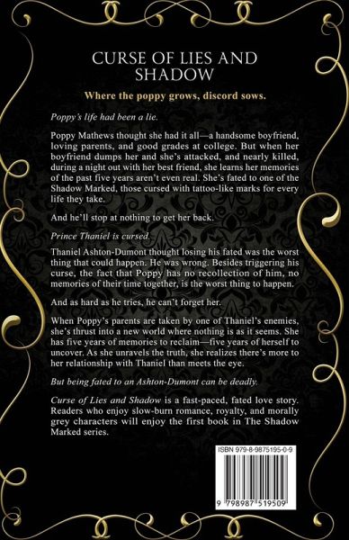 Poppy's life had been a lie. Poppy Mathews thought she had it all-a handsome boyfriend, loving parents, and good grades at college. But when her boyfriend dumps her and she's attacked, and nearly killed, during a night out with her best friend, she learns her memories of the past five years aren't even real. She's fated to one of the Shadow Marked, those cursed with tattoo-like marks for every life they take. And he'll stop at nothing to get her back. Prince Thaniel is cursed. Thaniel Ashton-Dumont thought losing his fated was the worst thing that could happen. He was wrong. Besides triggering his curse, the fact that Poppy has no recollection of him, no memories of their time together, is the worst thing to happen. And as hard as he tries, he can't forget her. When Poppy's parents are taken by one of Thaniel's enemies, she's thrust into a new world where nothing is as it seems. She has five years of memories to reclaim-five years of herself to uncover. As she unravels the truth, she realizes there's more to her relationship with Thaniel than meets the eye. But being fated to an Ashton-Dumont can be deadly. Curse of Lies and Shadow is a fast-paced, fated love story. Readers who enjoy slow-burn romance, royalty, and morally grey characters will enjoy the first book in The Shadow Marked series.