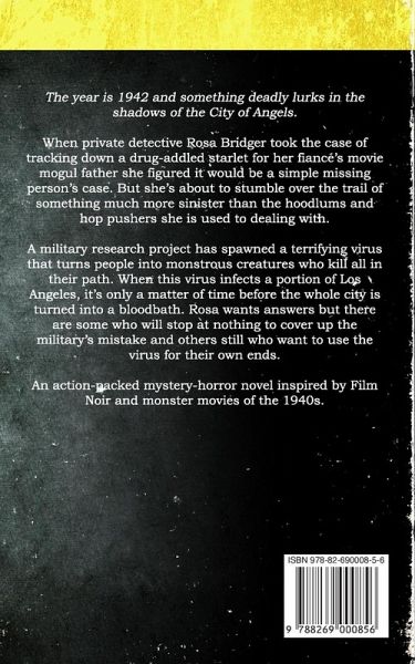 The year is 1942 and something deadly lurks in the shadows of the City of Angels. When private detective Rosa Bridger took the case of tracking down a drug-addled starlet for her fiancé's movie mogul father she figured it would be a simple missing person's case. But she's about to stumble over the trail of something much more sinister than the hoodlums and hop pushers she is used to dealing with. A military research project has spawned a terrifying virus that turns people into monstrous creatures who kill all in their path. When this virus infects a portion of Los Angeles, it's only a matter of time before the whole city is turned into a bloodbath. Rosa wants answers but there are some who will stop at nothing to cover up the military's mistake and others still who want to use the virus for their own ends. An action-packed mystery-horror novel inspired by Film Noir and monster movies of the 1940s.