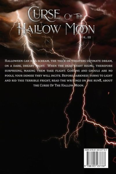Halloween can be a scream, the trick or treaters ultimate dream, on a dark, dreary night. When the dead start rising, therefore surprising, making them take flight. Goblins and ghouls are no fools, your demise they will incite. Before darkness turns to light and rid this terrible fright, read the writings on the rune, about the Curse Of The Hallow Moon.