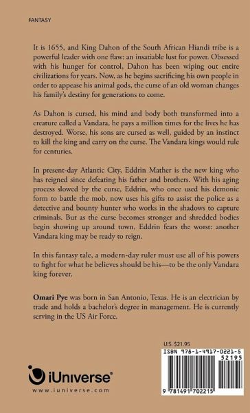 It is 1655, and King Dahon of the South African Hiandi tribe is a powerful leader with one fl aw: an insatiable lust for power. Obsessed with his hunger for control, Dahon has been wiping out entire civilizations for years. Now, as he begins sacrifi cing his own people in order to appease his animal gods, the curse of an old woman changes his family's destiny for generations to come. As Dahon is cursed, his mind and body both transformed into a creature called a Vandara, he pays a million times for the lives he has destroyed. Worse, his sons are cursed as well, guided by an instinct to kill the king and carry on the curse. The Vandara kings would rule for centuries. In present-day Atlantic City, Eddrin Mather is the new king who has reigned since defeating his father and brothers. With his aging process slowed by the curse, Eddrin, who once used his demonic form to battle the mob, now uses his gifts to assist the police as a detective and bounty hunter who works in the shadows to capture criminals. But as the curse becomes stronger and shredded bodies begin showing up around town, Eddrin fears the worst: another Vandara king may be ready to reign. In this fantasy tale, a modern-day ruler must use all of his powers to fight for what he believes should be his-to be the only Vandara king forever.