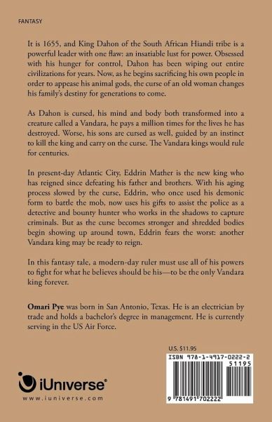 It is 1655, and King Dahon of the South African Hiandi tribe is a powerful leader with one fl aw: an insatiable lust for power. Obsessed with his hunger for control, Dahon has been wiping out entire civilizations for years. Now, as he begins sacrifi cing his own people in order to appease his animal gods, the curse of an old woman changes his family's destiny for generations to come. As Dahon is cursed, his mind and body both transformed into a creature called a Vandara, he pays a million times for the lives he has destroyed. Worse, his sons are cursed as well, guided by an instinct to kill the king and carry on the curse. The Vandara kings would rule for centuries. In present-day Atlantic City, Eddrin Mather is the new king who has reigned since defeating his father and brothers. With his aging process slowed by the curse, Eddrin, who once used his demonic form to battle the mob, now uses his gifts to assist the police as a detective and bounty hunter who works in the shadows to capture criminals. But as the curse becomes stronger and shredded bodies begin showing up around town, Eddrin fears the worst: another Vandara king may be ready to reign. In this fantasy tale, a modern-day ruler must use all of his powers to fight for what he believes should be his-to be the only Vandara king forever.