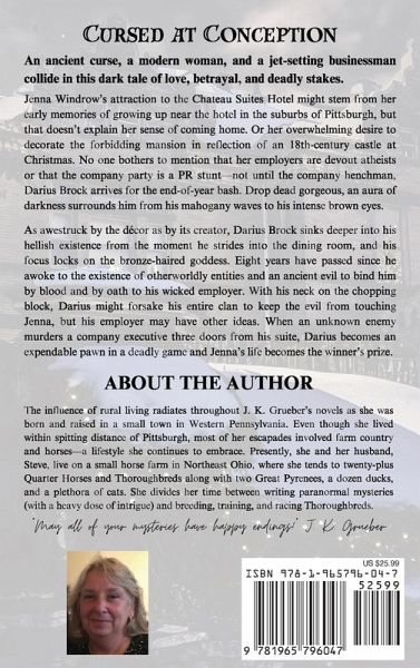 An ancient curse, a modern woman, and a jet-setting businessman collide in this dark tale of love, betrayal, and deadly stakes. Jenna Windrow's attraction to the Chateau Suites Hotel might stem from her early memories of growing up near the hotel in the suburbs of Pittsburgh, but that doesn't explain her sense of coming home. Or her overwhelming desire to decorate the forbidding mansion in reflection of an 18th-century castle at Christmas. No one bothers to mention that her employers are devout atheists or that the company party is a PR stunt-not until the company henchman, Darius Brock arrives for the end-of-year bash. Drop dead gorgeous, an aura of darkness surrounds him from his mahogany waves to his intense brown eyes. As awestruck by the décor as by its creator, Darius Brock sinks deeper into his hellish existence from the moment he strides into the dining room, and his focus locks on the bronze-haired goddess. Eight years have passed since he awoke to the existence of otherworldly entities and an ancient evil to bind him by blood and by oath to his wicked employer. With his neck on the chopping block, Darius might forsake his entire clan to keep the evil from touching Jenna, but his employer may have other ideas. When an unknown enemy murders a company executive three doors from his suite, Darius becomes an expendable pawn in a deadly game and Jenna's life becomes the winner's prize.