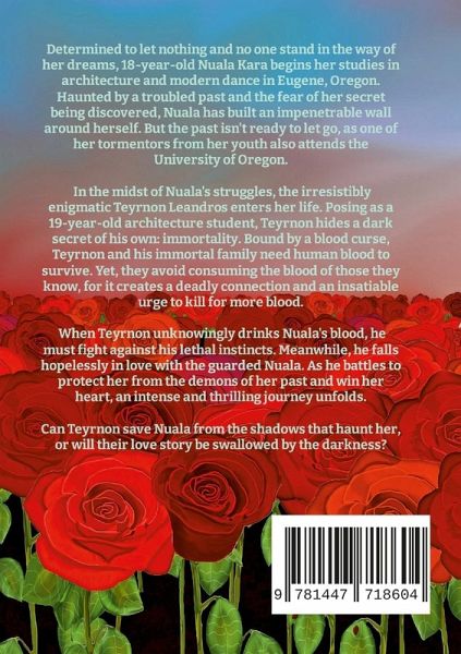 Determined to let nothing and no one stand in the way of her dreams, 18-year-old Nuala Kara begins her studies in architecture and modern dance in Eugene, Oregon. Haunted by a troubled past and the fear of her secret being discovered, Nuala has built an impenetrable wall around herself. But the past isn't ready to let go, as one of her tormentors from her youth also attends the University of Oregon. In the midst of Nuala's struggles, the irresistibly enigmatic Teyrnon Leandros enters her life. Posing as a 19-year-old architecture student, Teyrnon hides a dark secret of his own: immortality. Bound by a blood curse, Teyrnon and his immortal family need human blood to survive. Yet, they avoid consuming the blood of those they know, for it creates a deadly connection and an insatiable urge to kill for more blood. When Teyrnon unknowingly drinks Nuala's blood, he must fight against his lethal instincts. Meanwhile, he falls hopelessly in love with the guarded Nuala. As he battles to protect her from the demons of her past and win her heart, an intense and thrilling journey unfolds. Can Teyrnon save Nuala from the shadows that haunt her, or will their love story be swallowed by the darkness?