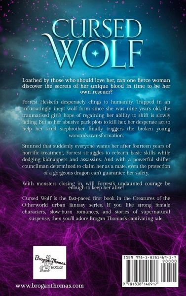 Loathed by those who should love her, can one fierce woman discover the secrets of her unique blood in time to be her own rescuer? Forrest Hesketh desperately clings to humanity. Trapped in an infuriatingly inept wolf form since she was nine years old, the traumatised girl's hope of regaining her ability to shift is slowly fading. But as her abusive pack plots to kill her, her desperate act to help her kind stepbrother finally triggers the broken young woman's transformation. Stunned that suddenly everyone wants her after fourteen years of horrific treatment, Forrest struggles to relearn basic skills while dodging kidnappers and assassins. And with a powerful shifter councilman determined to claim her as a mate, even the protection of a gorgeous dragon can't guarantee her safety. With monsters closing in, will Forrest's undaunted courage be enough to keep her alive? Cursed Wolf is the fast-paced first standalone book in the Creatures of the Otherworld urban fantasy series. If you like strong female characters, slow-burn romances, and stories of supernatural suspense, then you'll adore Brogan Thomas's captivating tale. Buy Cursed Wolf to make enemies howl for mercy today!