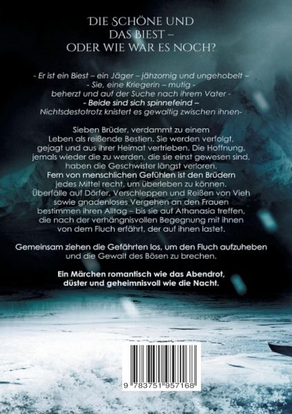 Die Schöne und das Biest, oder wie war es noch? Er ist ein Biest, ein Jäger, jähzornig und ungehobelt. Sie, eine Kriegerin, mutig, beherzt und auf der Suche nach ihrem Vater. Beide sind sich spinnefeind - Nichtsdestotrotz knistert es gewaltig zwischen ihnen. Sieben Brüder, verdammt zu einem Leben als reißende Bestien. Sie werden verfolgt, gejagt und aus ihrer Heimat vertrieben. Die Hoffnung, jemals wieder die zu werden, die sie einst gewesen sind, haben die Geschwister längst verloren. Fern von menschlichen Gefühlen ist den Brüdern jedes Mittel recht, um überleben zu können. Überfälle auf Dörfer, Verschleppen und Reißen von Vieh sowie gnadenloses Vergehen an den Frauen bestimmen ihren Alltag, bis sie auf Athanasia treffen, die nach der verhängnisvollen Begegnung mit ihnen von dem Fluch erfährt, der auf ihnen lastet. Gemeinsam ziehen die Gefährten los, um den Fluch aufzuheben und die Gewalt des Bösen zu brechen. Ein Märchen romantisch wie das Abendrot, düster und geheimnisvoll wiedie Nacht.