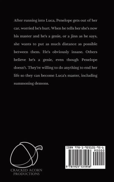 Genre: Young Adult Urban Fantasy/Horror (with elements of romance). After running into Luca, Penelope gets out of her car, worried he's hurt. When he tells her she's now his master and he's a genie, or a jinn as he says, she wants to put as much distance as possible between them. He's obviously insane. Others believe he's a genie, even though Penelope doesn't. They're willing to do anything to end her life so they can become Luca's master, including summoning demons. This story was written by an Australian author using Australian spelling.