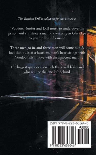 The Russian Doll is called on for one last case. Voodoo, Hunter and Doll must go undercover in prison and convince a man known only as Glass Eye to give up his informant. Three men go in, and three men will come out. A fact that pulls at a heartless man's heartstrings when Voodoo falls in love with an innocent man. The biggest question is which three will leave and who will be the one left behind. This book contains dark themes which may be triggering to some people. This includes threatened rape, investigating paedophiles, sex and violence. This book contains mm relationships.