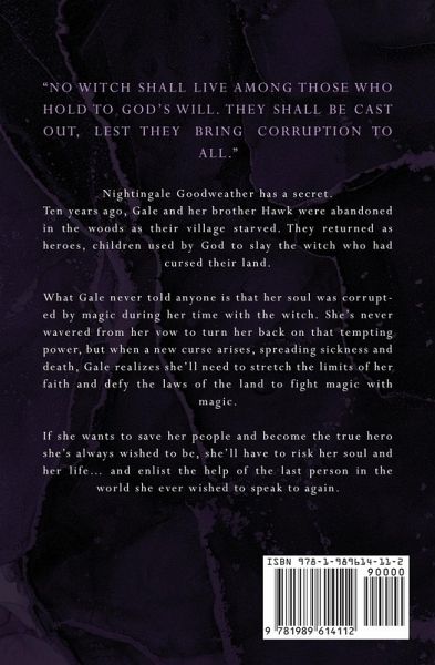 "No witch shall live among those who hold to God's will. They shall be cast out, lest they bring corruption to all." Nightingale Goodweather has a secret. Ten years ago, Gale and her brother Hawk were abandoned in the woods as their village starved. They returned as heroes, children used by God to slay the witch who had cursed their land. What Gale never told anyone is that her soul was corrupted by magic during her time with the witch. She's never wavered from her vow to turn her back on that tempting power, but when a new curse arises, spreading sickness and death, Gale realizes she'll need to stretch the limits of her faith and defy the laws of the land to fight magic with magic. If she wants to save her people and become the true hero she's always wished to be, she'll have to risk her soul and her life... and enlist the help of the last person in the world she ever wished to speak to again.