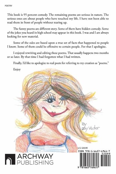 This book is 95 percent comedy. The remaining poems are serious in nature. The serious ones are about people who have touched my life. I have not been able to read them in front of people without tearing up. The funny poems are different story. Some of them have hidden comedy. Some of the jokes you heard in high school may appear in this book. I was and I am always looking for new material. Some of the odes are based upon a true set of facts that happened to people I know. Some of them could be offensive to certain people. For that I apologize. I enjoyed rewriting and editing these poems. That usually happens two months or so later. By that time I had forgotten what I had written. Finally, I'd like to apologize to real poets for referring to my creation as "poems." Enjoy