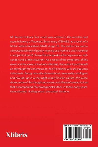M. Renae Dubois' first novel was written in the months and years following a Traumatic Brain Injury, (TBI/ABI), as a result of a Motor Vehicle Accident (MVA) at age 16. The author has used a conversational style of poetry, rhyming and rhythmic, and it is similar in subject to how M. Renae Dubois speaks of her experience:- with candor and a little irreverent. As a result of the symptoms of this event and the areas of the brain affected, the author found herself an easy target for lecherous men, and friendships with unscrupulous individuals. Being naturally philosophical, reasonably intelligent and brought up in a very right wing Christian culture, this piece shows some of the thought processes and lifestyle/career choices that accompanied the protagonist/author in these early years. Unmedicated. Undiagnosed. Untreated. Undone.